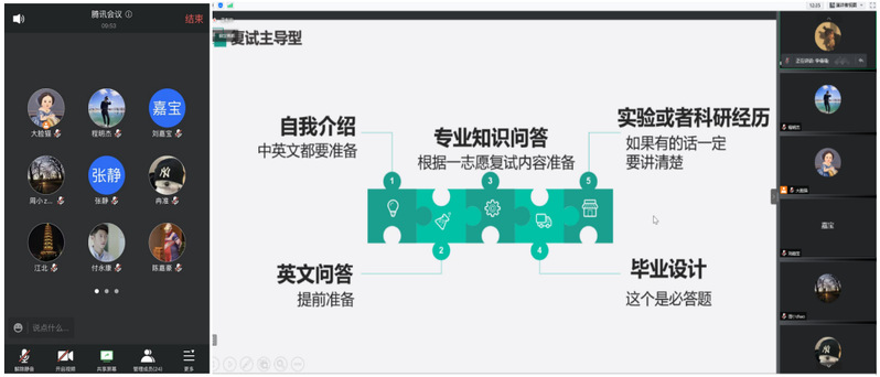 会上,学院20届毕业生、大连理工大学研究生赵嘉琪分享了线上复试的流程及注意事项,分析了复试各个环节需要关注的细节,强调在复试过程中要结合自身实际,向导师展示自己的专业特长。20届毕业生、上海理工大学研究生李倩倩结合自身调剂的经验,强调了调整心态的重要性,她鼓励初试不理想的同学要做好充分准备,拓宽信息渠道,密切关注调剂信息,积极主动联系调剂学校,把握机会顺利“上岸”。两位同学也围绕同学们关心的问题做了详细解答,气氛热烈。