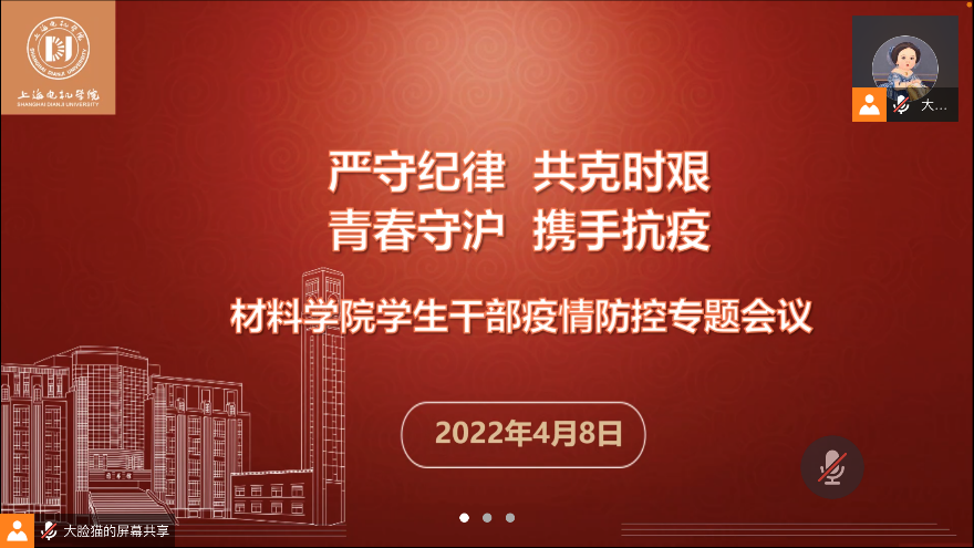4月8日,为进一步压紧压实工作责任,筑牢疫情防控防线,材料学院召开线上学生干部疫情防控专题会议。学院直属党支部c副书记、副院长张静,全体辅导员,全体学生干部参加会议,会议由赵璞主持。