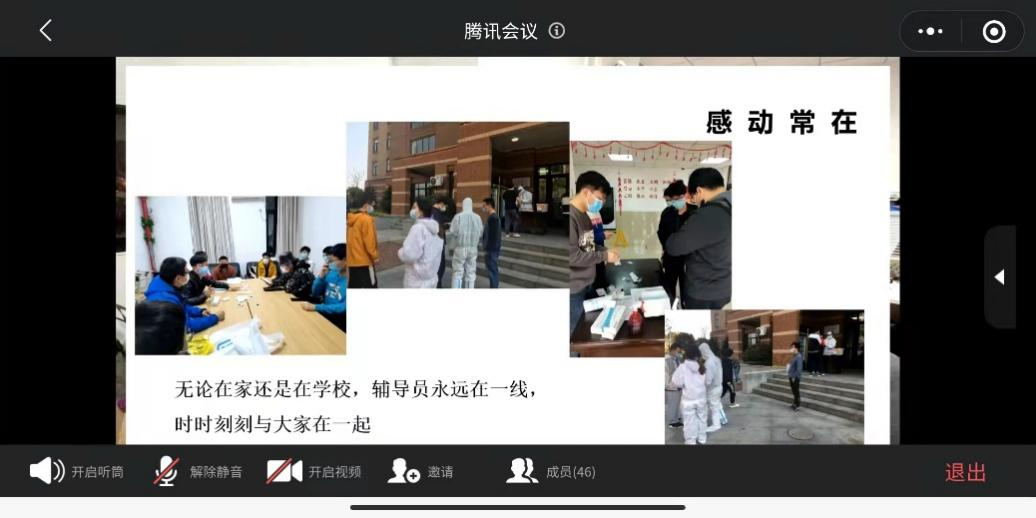 居健、王博分别作为大四学生代表和志愿者代表进行了分享,赵璞、杜浩明、程明杰、周子朝等辅导员从学习、生活、心理等各方面提出了要求和建议,强调线上学习不能松、思政教育不断线,鼓励积极开展各项主题活动,展现青年学生抗疫必胜的决心,传播正能量。
